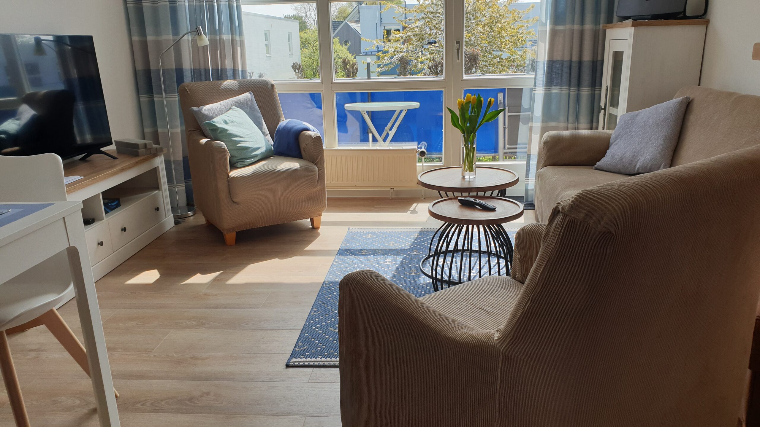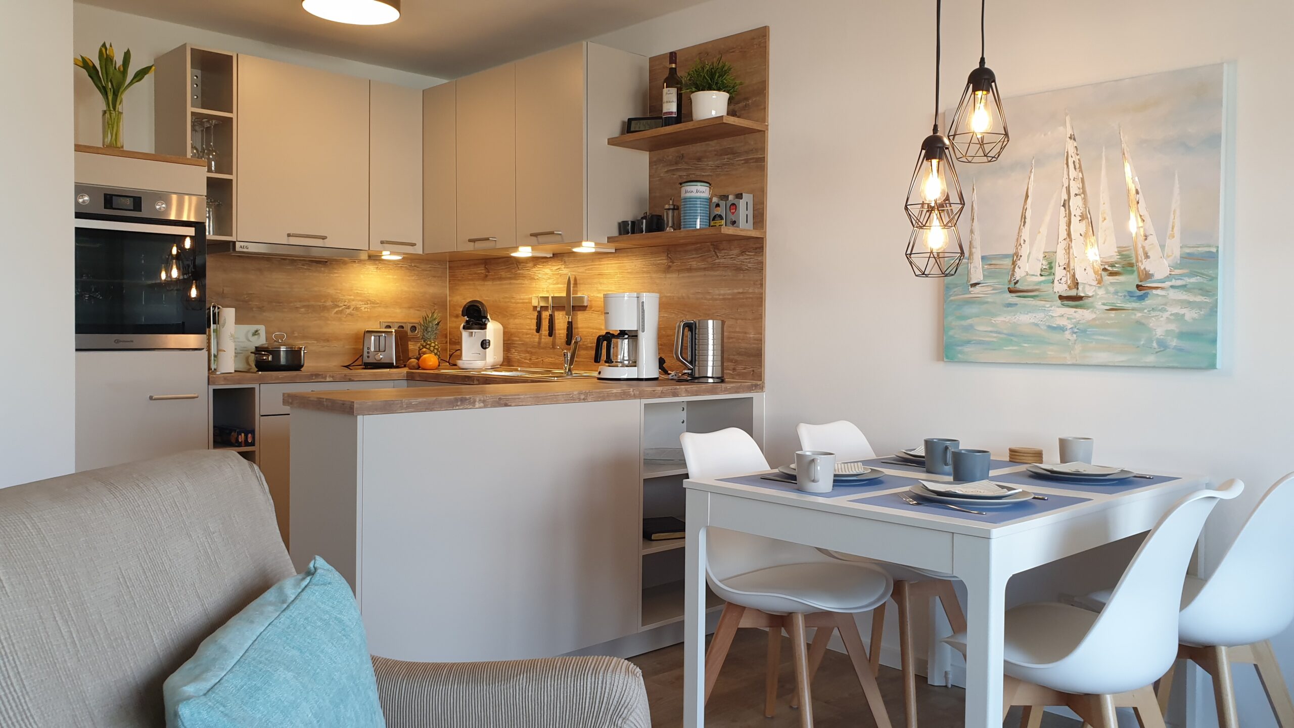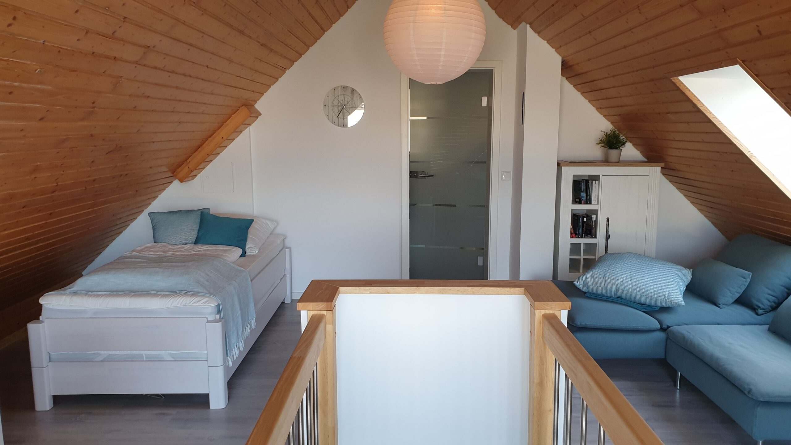 Unsere moderne, gemütliche und im maritimen Stil eingerichtete Ferienwohnung liegt im 1. OG einer kleinen Wohnanlage. Die Wohnung ist in sich in zwei Ebenen unterteilt. Im unteren Bereich verfügt sie über einen Wohn- und Essbereich mit integrierter Küche, einem separaten Schlafzimmer sowie einem Duschbad. Der Balkon ist nach Süden ausgerichtet. Über die Innentreppe gelangt man ins offene, lichtdurchflutete Dachgeschoss, das einen weiteren Schlafbereich sowie ein WC bietet.