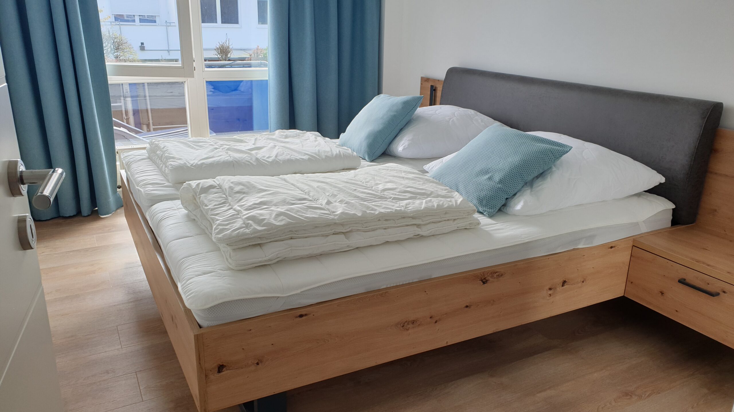 Doppelbett (180 x 200 cm), Kleiderschrank sowie zwei stapelbare Einzelbetten im DG. Babyreisebett mit Matratze und Bettschutzgitter stehen zur Verfügung.